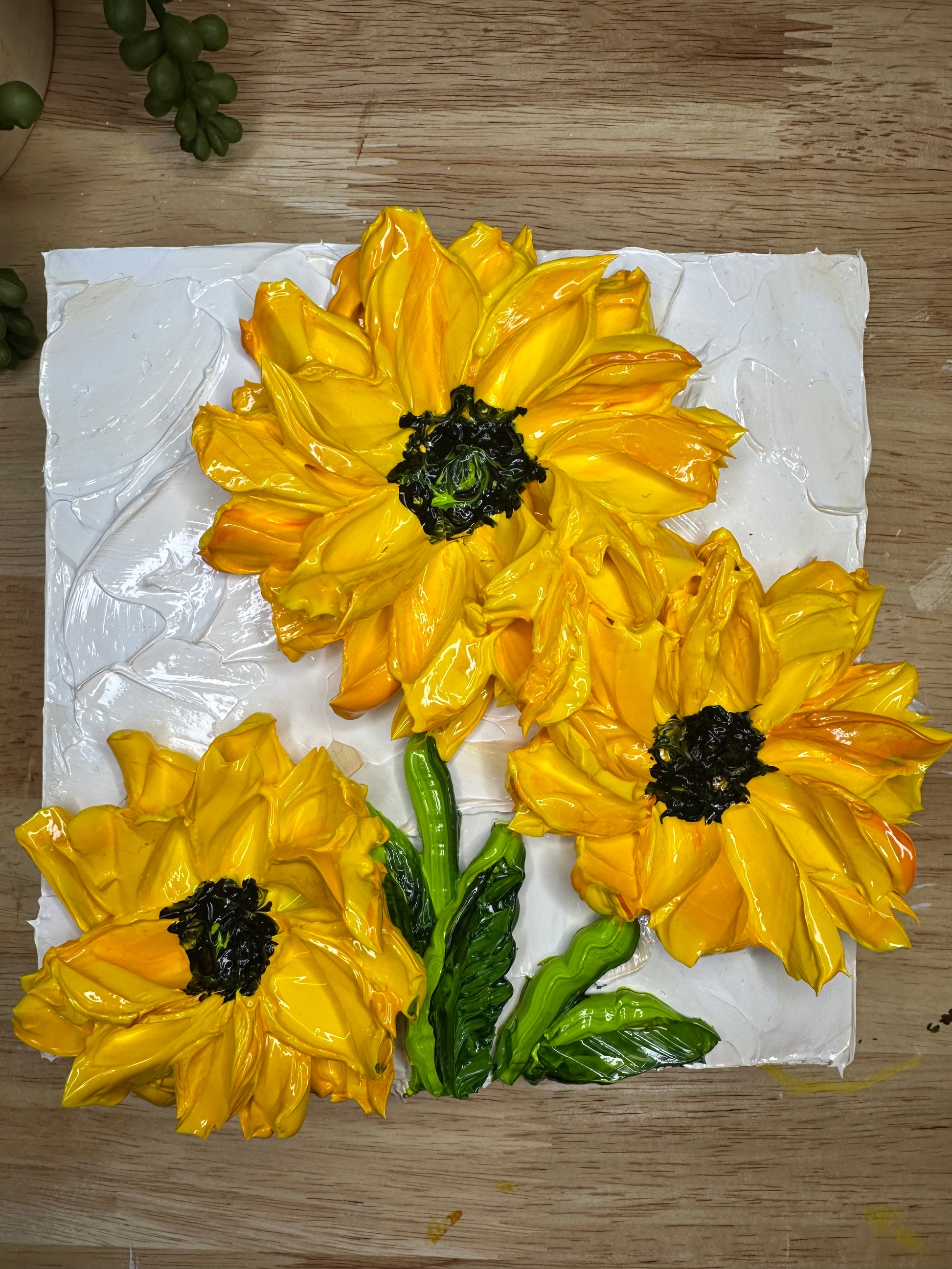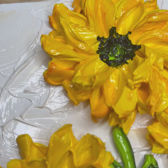 This mini sunflower painting is created with rich, raised texture using a super-thick impasto technique that gives every petal depth and dimension. Painted on a sturdy 6x6 wooden panel, it brings a warm, cheerful touch to any room — from your bedside table to a cozy gallery wall.