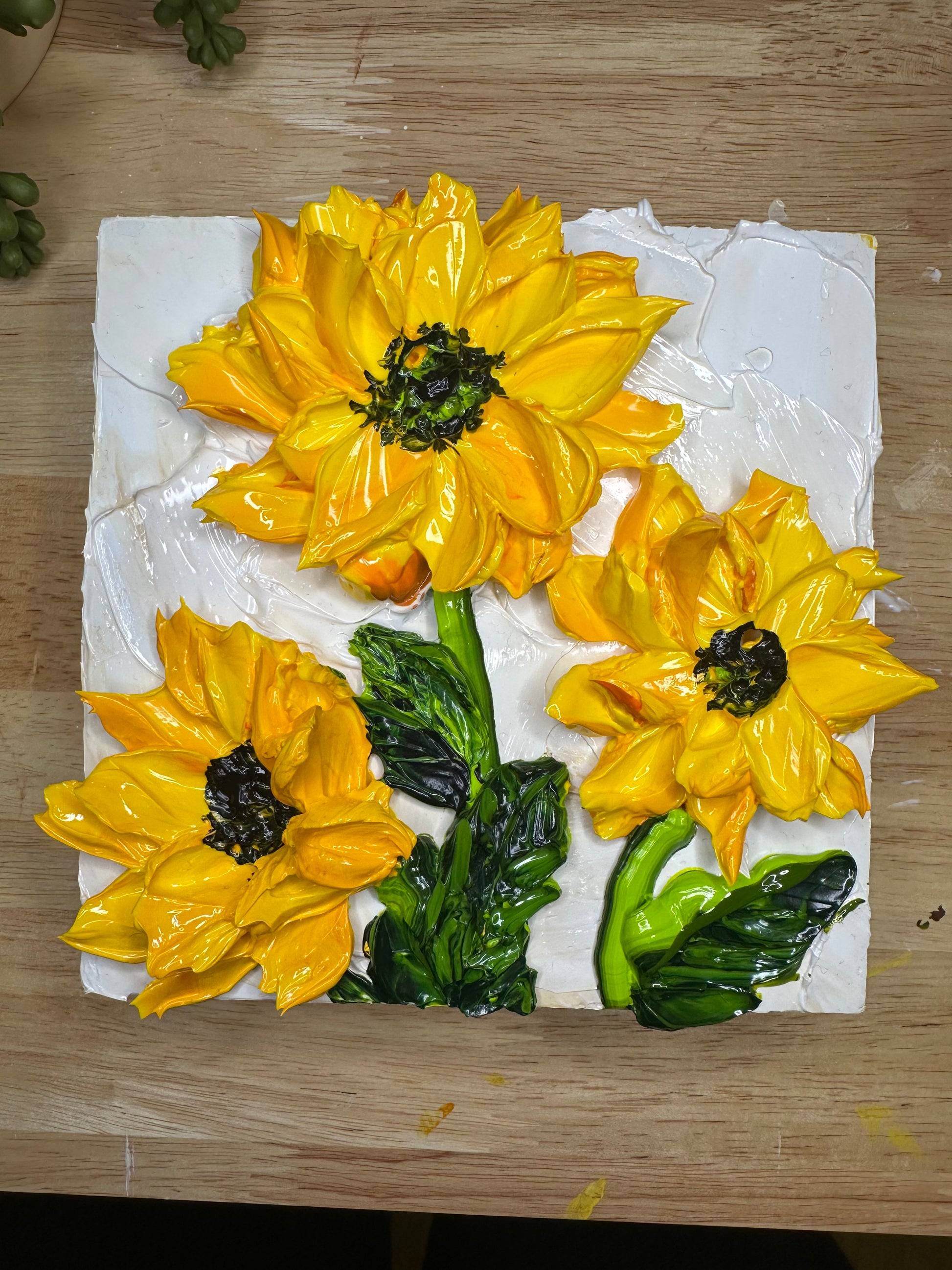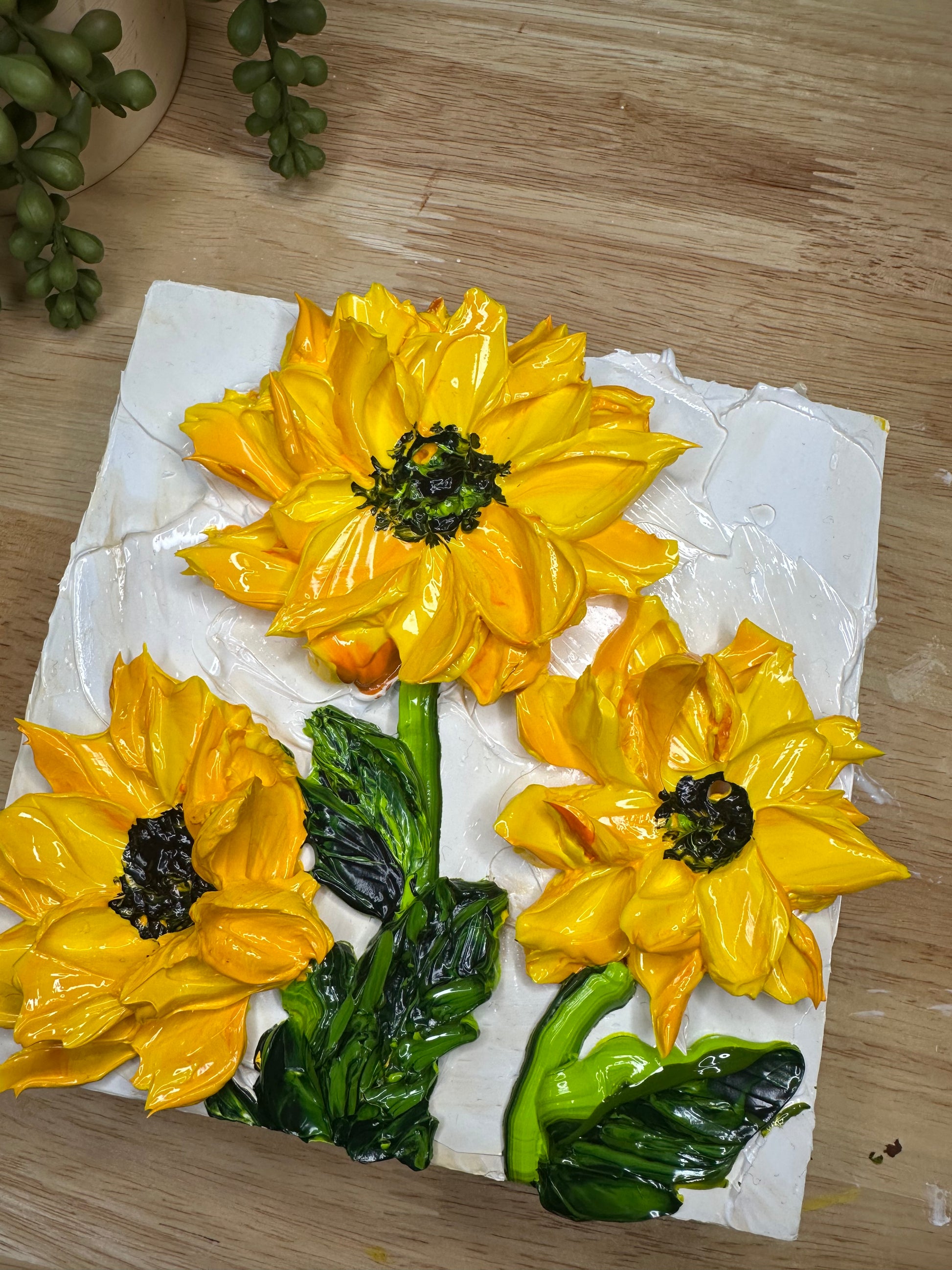 This mini sunflower painting is created with rich, raised texture using a super-thick impasto technique that gives every petal depth and dimension. Painted on a sturdy 6x6 wooden panel, it brings a warm, cheerful touch to any room — from your bedside table to a cozy gallery wall.