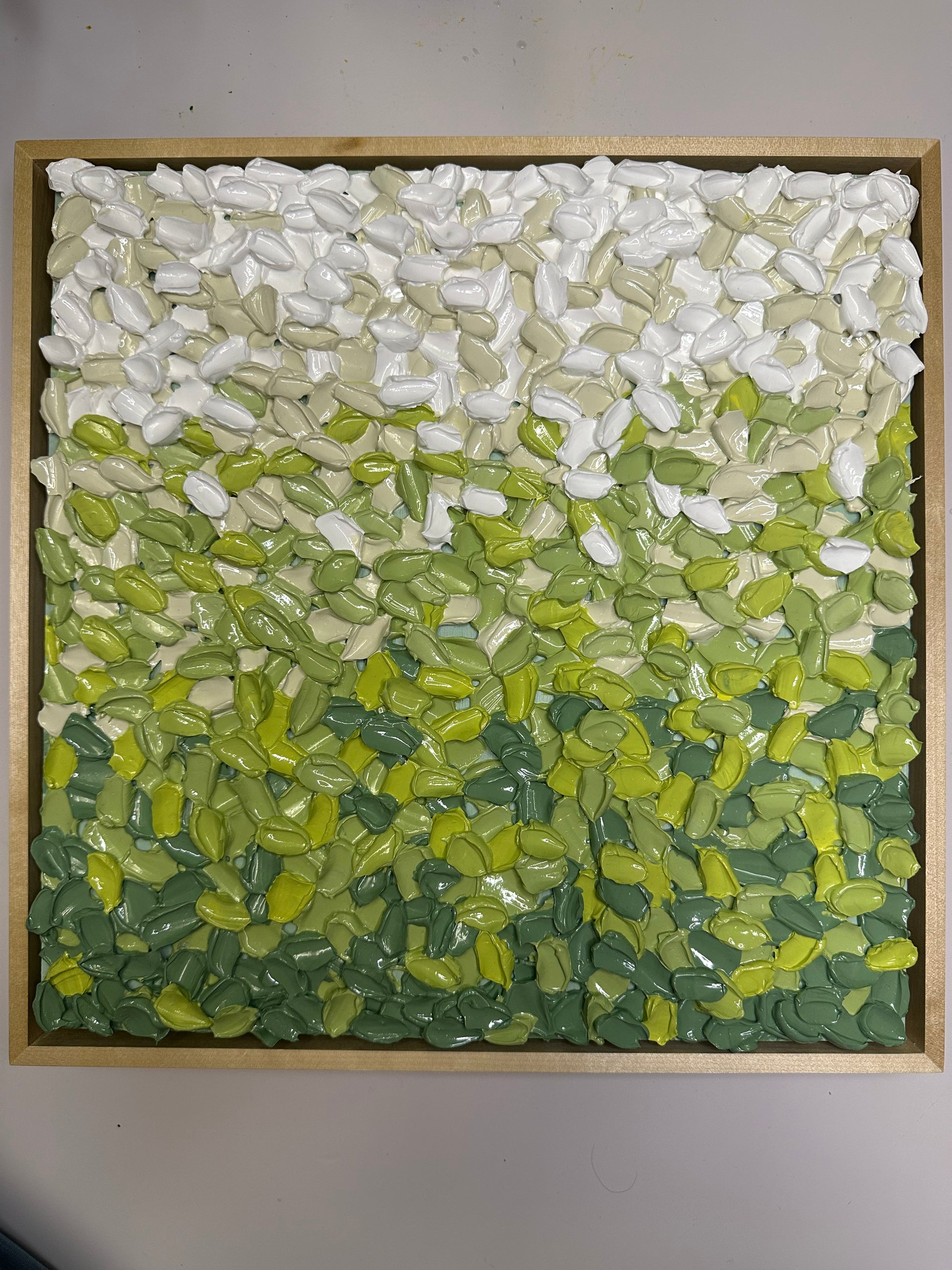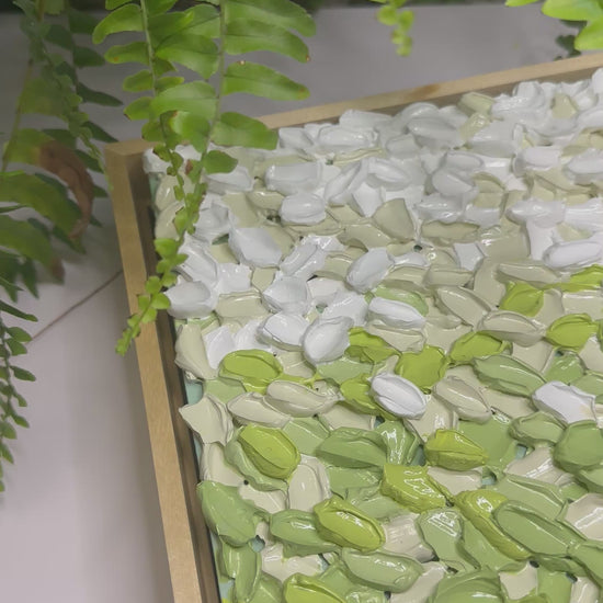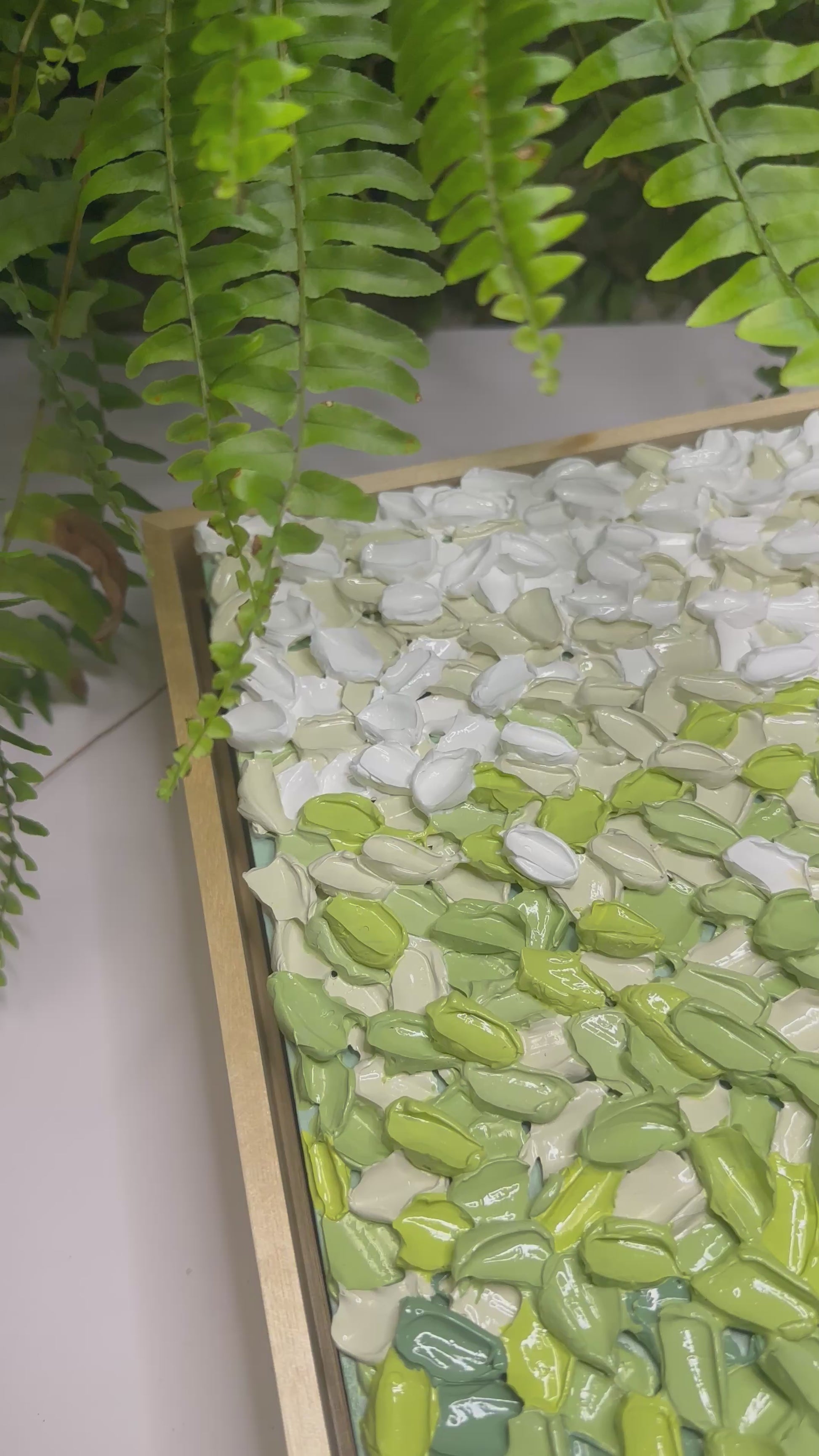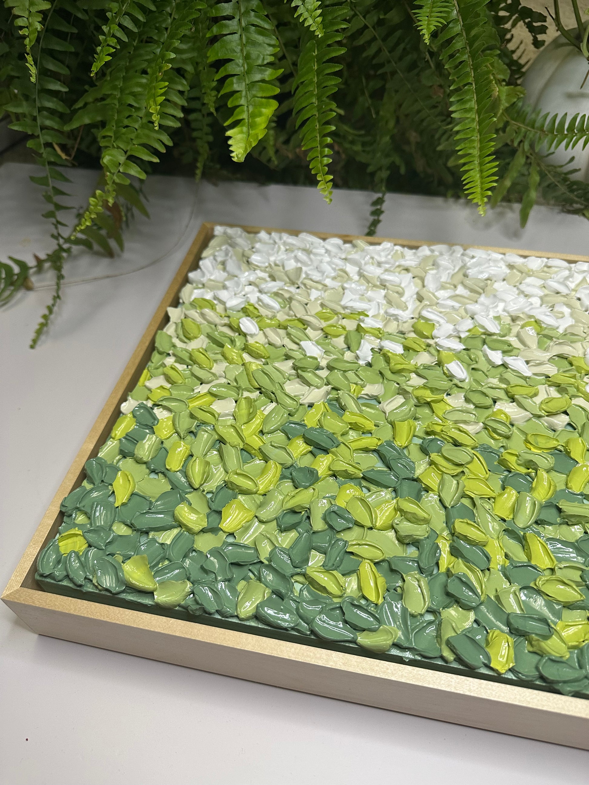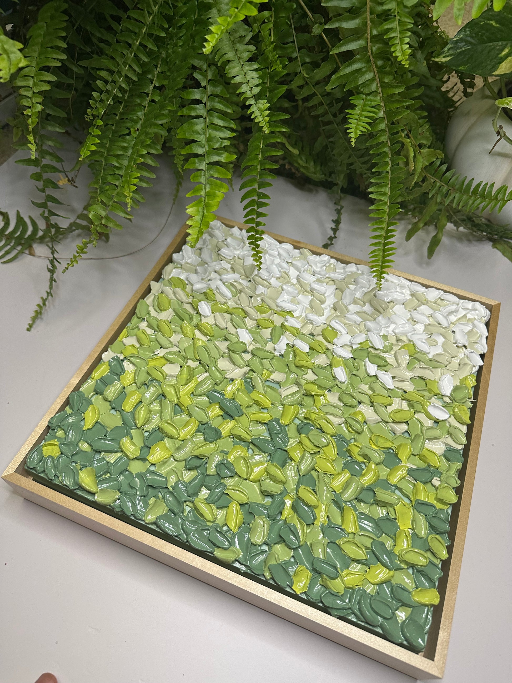 Built with super thick, sculptural texture, the surface is layered in soft, earthy greens that feel steady and grounding. The texture invites you to linger, creating a sense of depth and movement while keeping the overall feeling quiet and restful. As the light moves across it throughout the day, the piece subtly shifts, offering a calm presence without demanding attention.