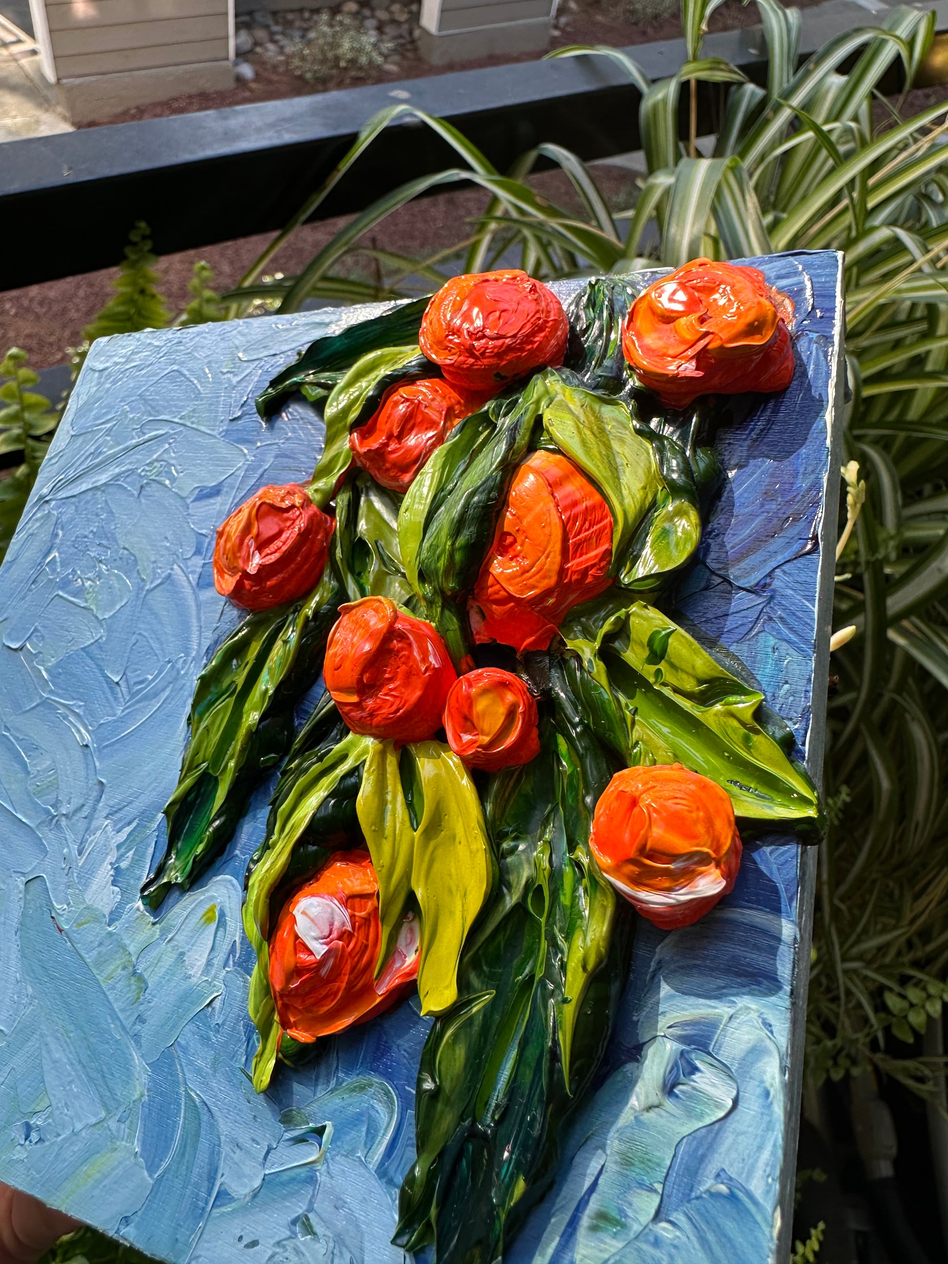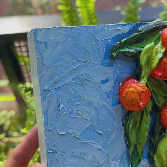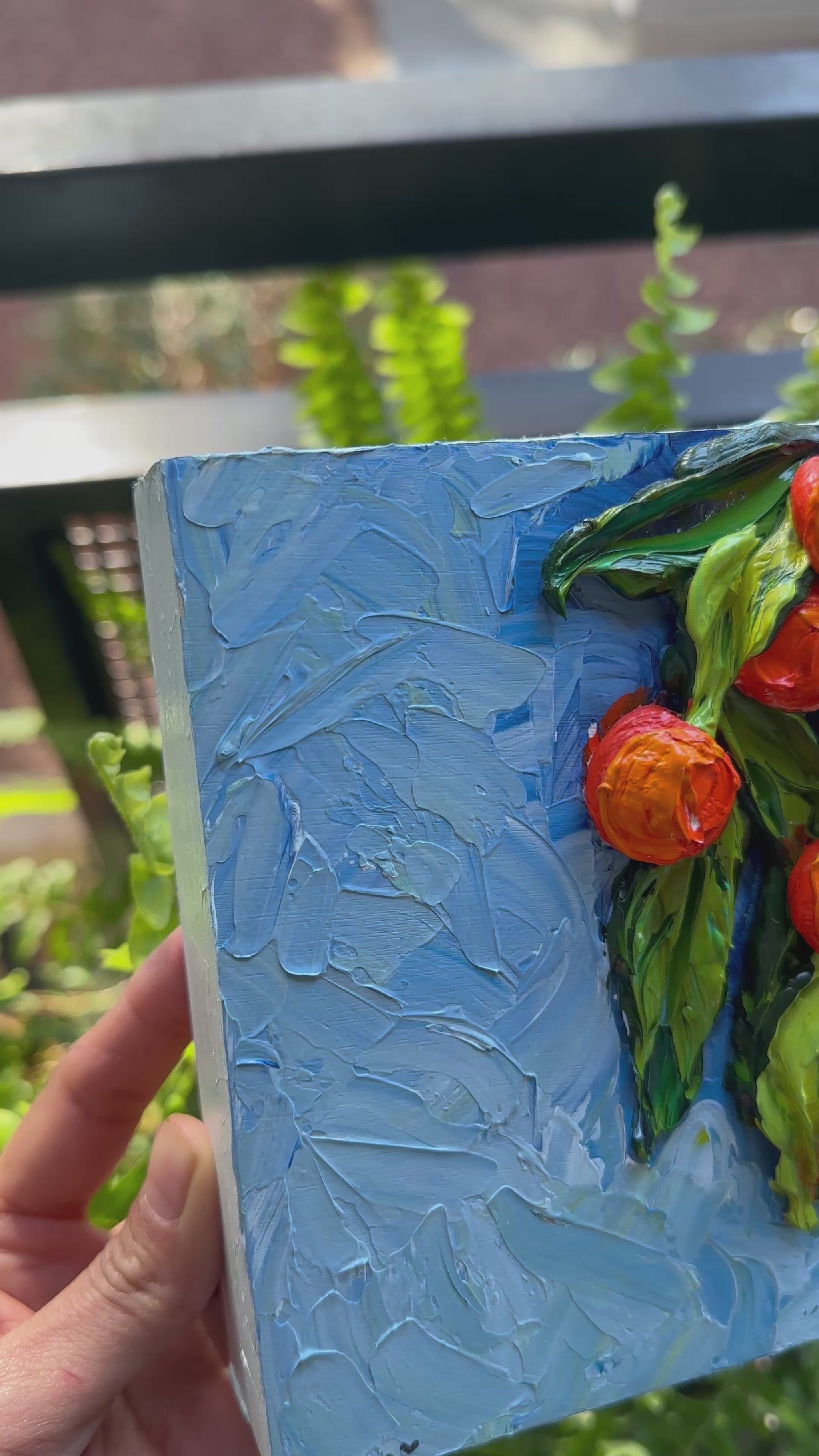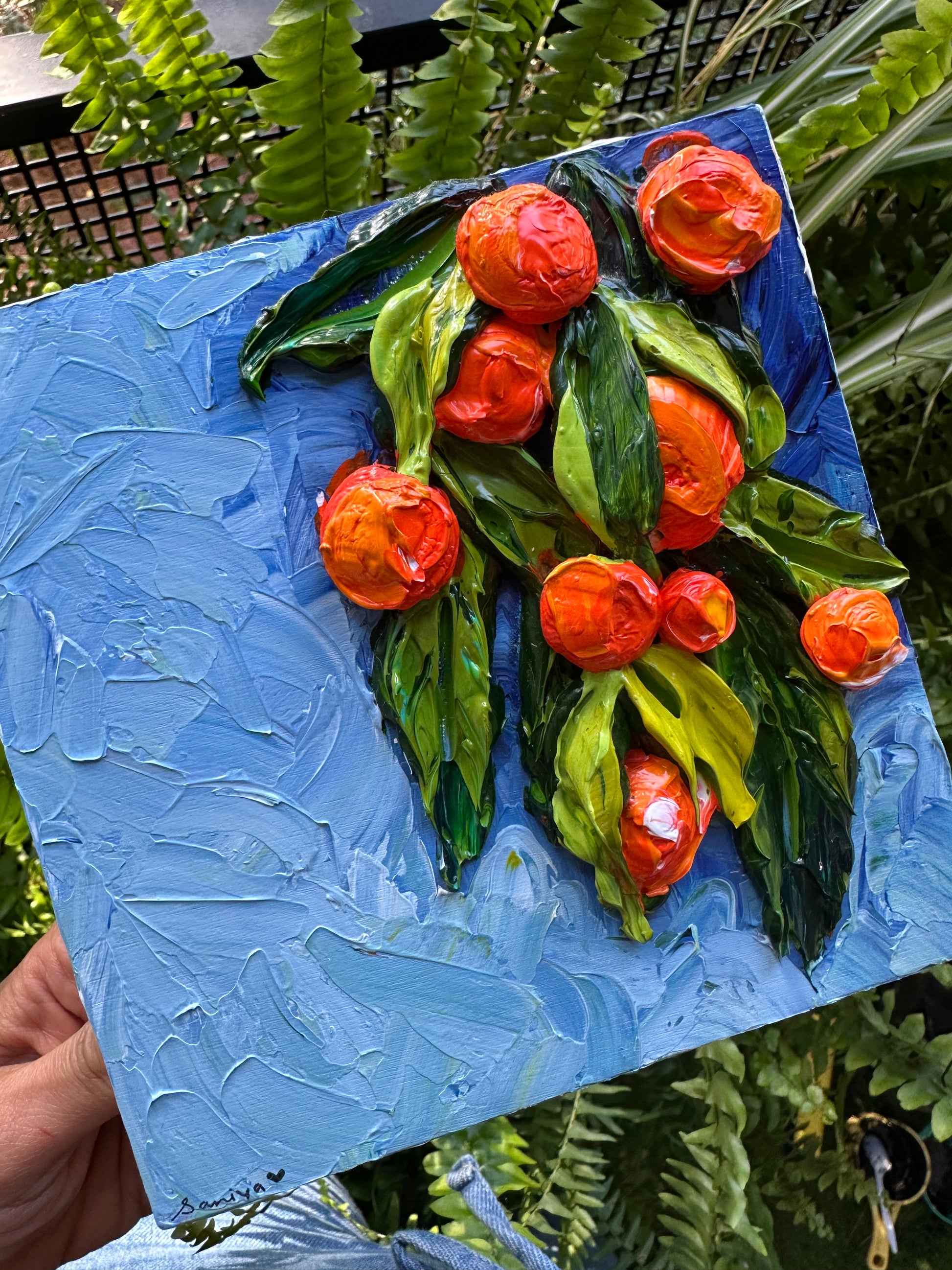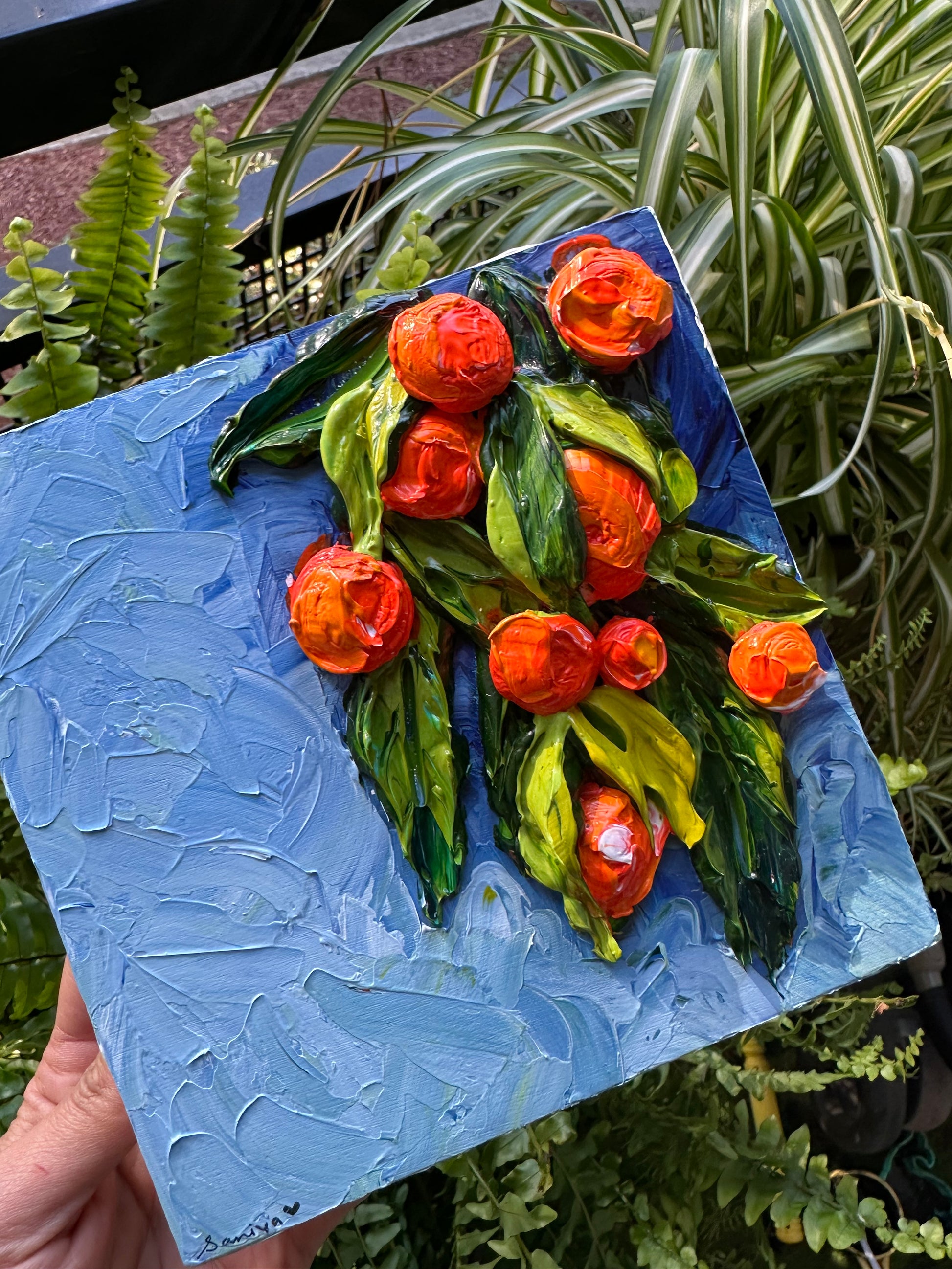 This stunning 6x6 inch painting showcases a vibrant orange tree with rich, textured brushstrokes that create depth and life. The bold, warm tones and dynamic texture make it a one-of-a-kind piece of art on a natural wood panel. Perfect for brightening up your space, this original painting adds a touch of citrus-inspired charm to any room, making it an ideal gift for art lovers or nature enthusiasts.