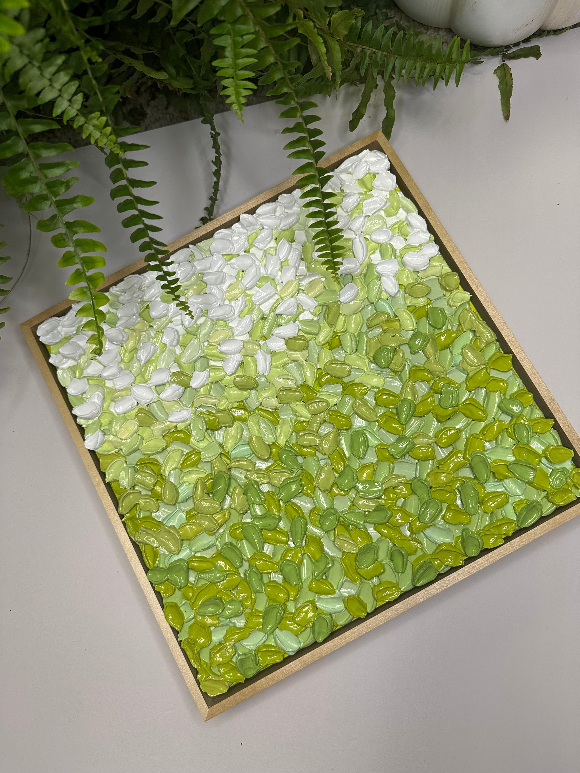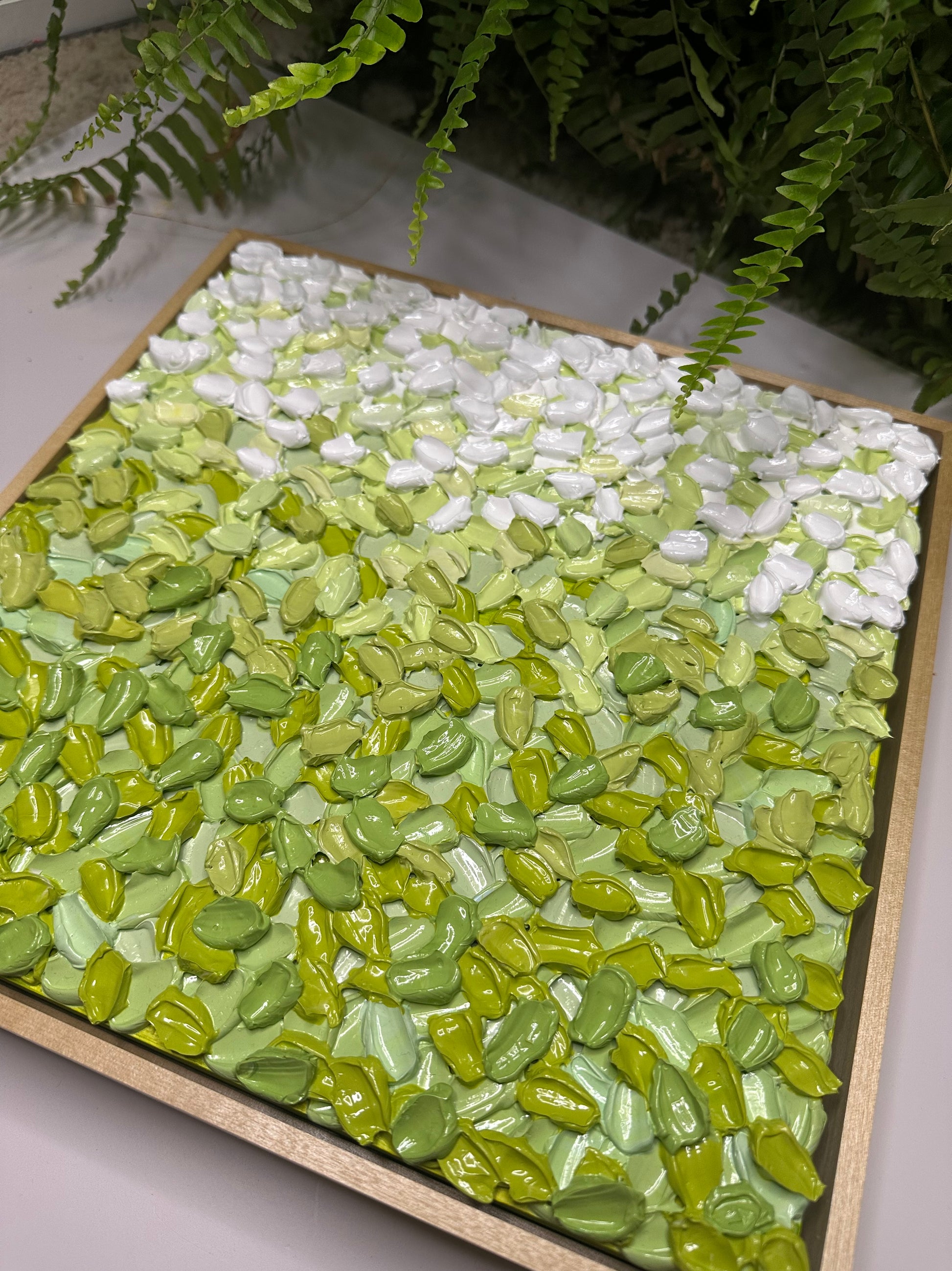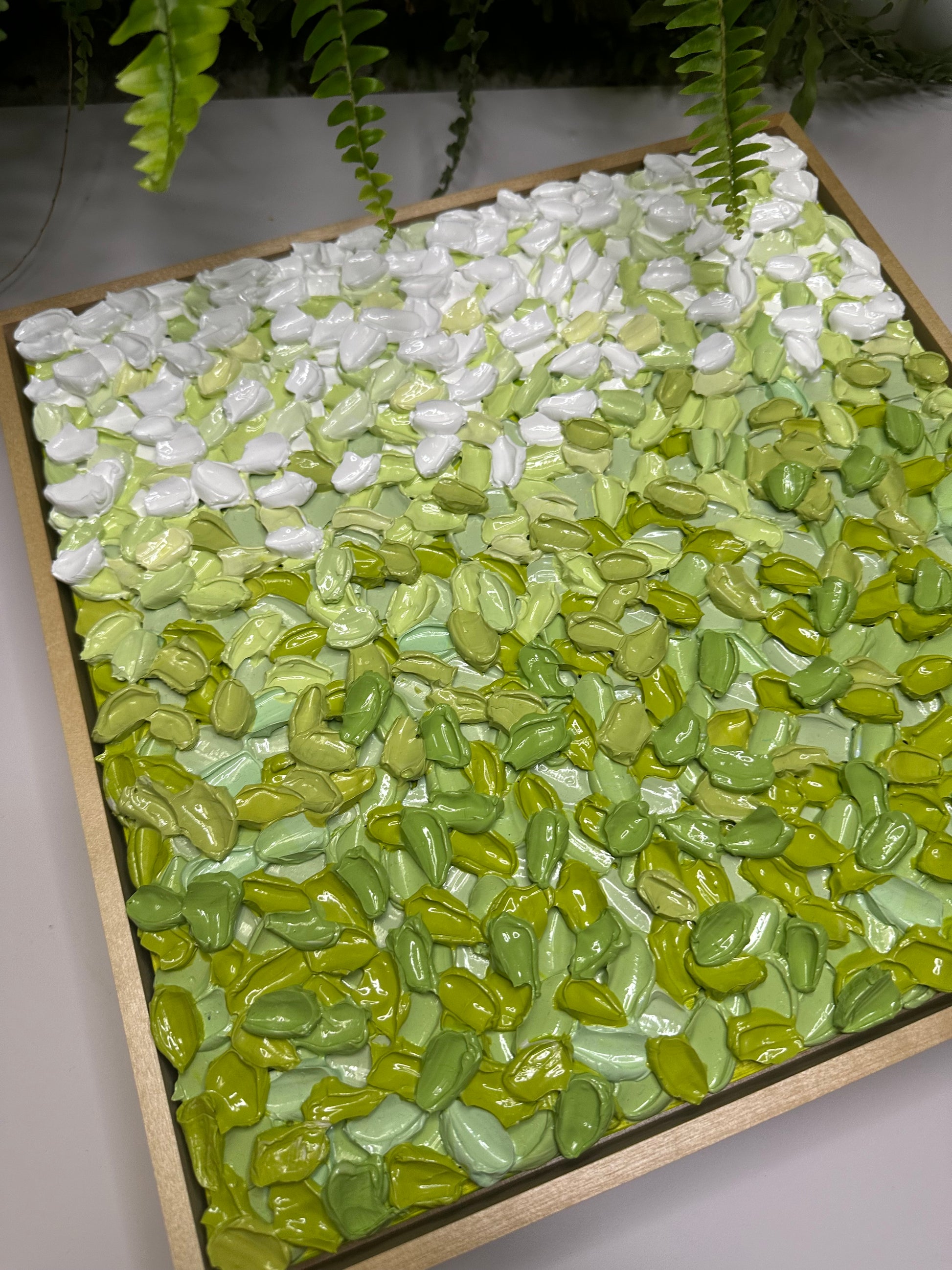 Built with super thick, sculptural texture, the surface is layered in soft, earthy greens that feel grounding and steady. The texture holds gentle movement without feeling overwhelming, inviting you to slow down and really look. As natural light shifts across the surface, the piece reveals subtle changes, offering a calm presence that settles into its space rather than competing with it.
