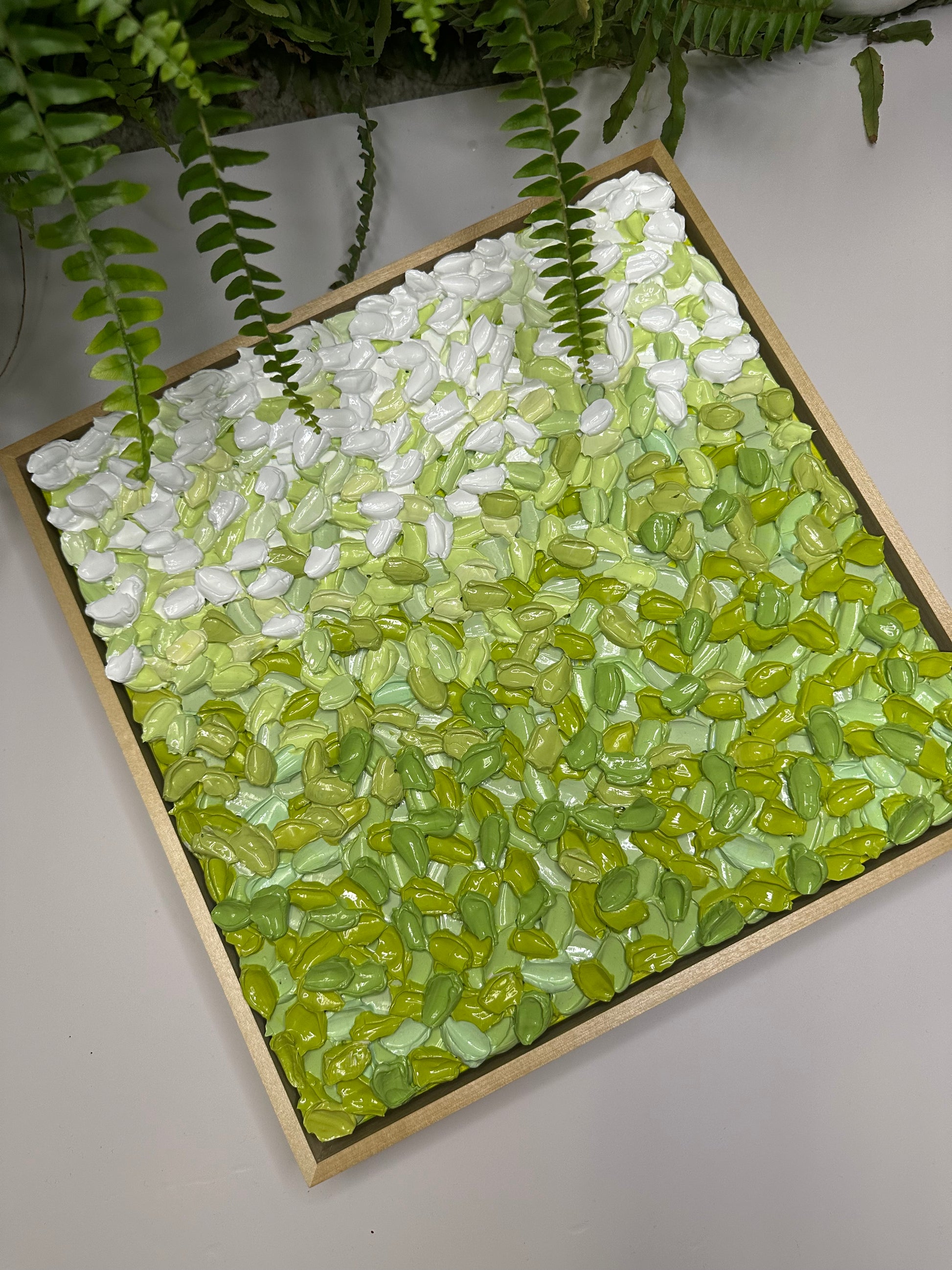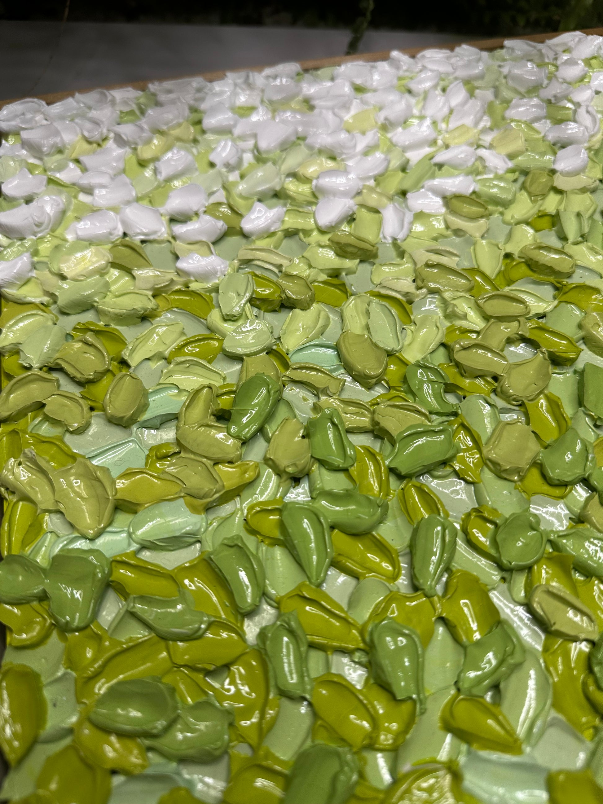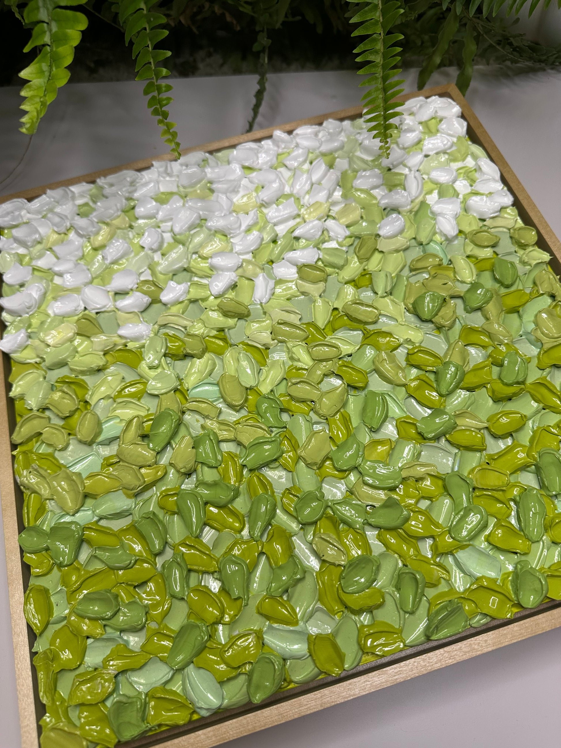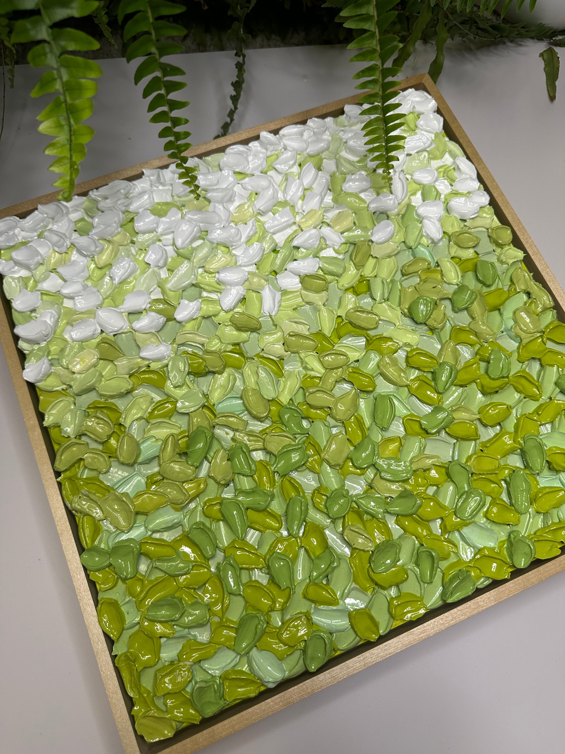 Built with super thick, sculptural texture, the surface is layered in soft, earthy greens that feel grounding and steady. The texture holds gentle movement without feeling overwhelming, inviting you to slow down and really look. As natural light shifts across the surface, the piece reveals subtle changes, offering a calm presence that settles into its space rather than competing with it.