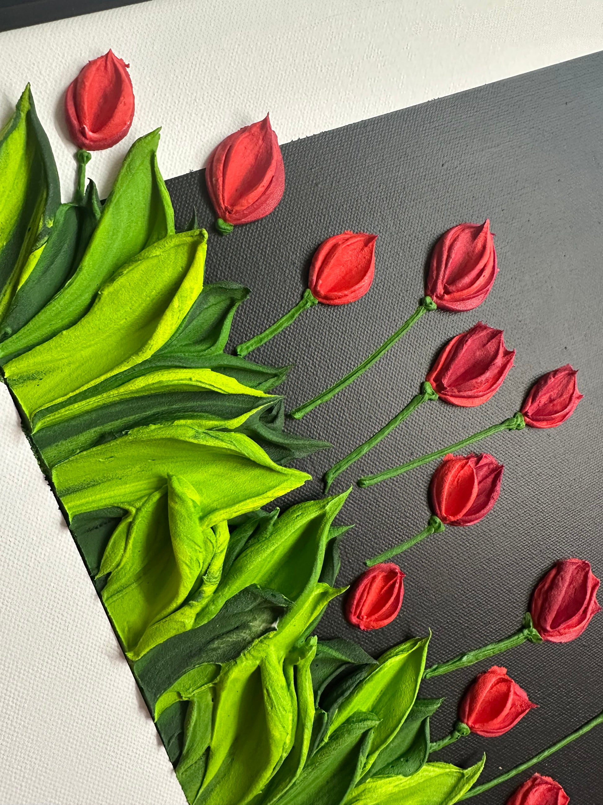 Each petal is sculpted with a palette knife in rich, thick layers of acrylic, giving this piece incredible depth and a luxurious tactile feel. The black background makes the red tulips glow with striking contrast — a perfect blend of drama and sophistication for any home or office.
