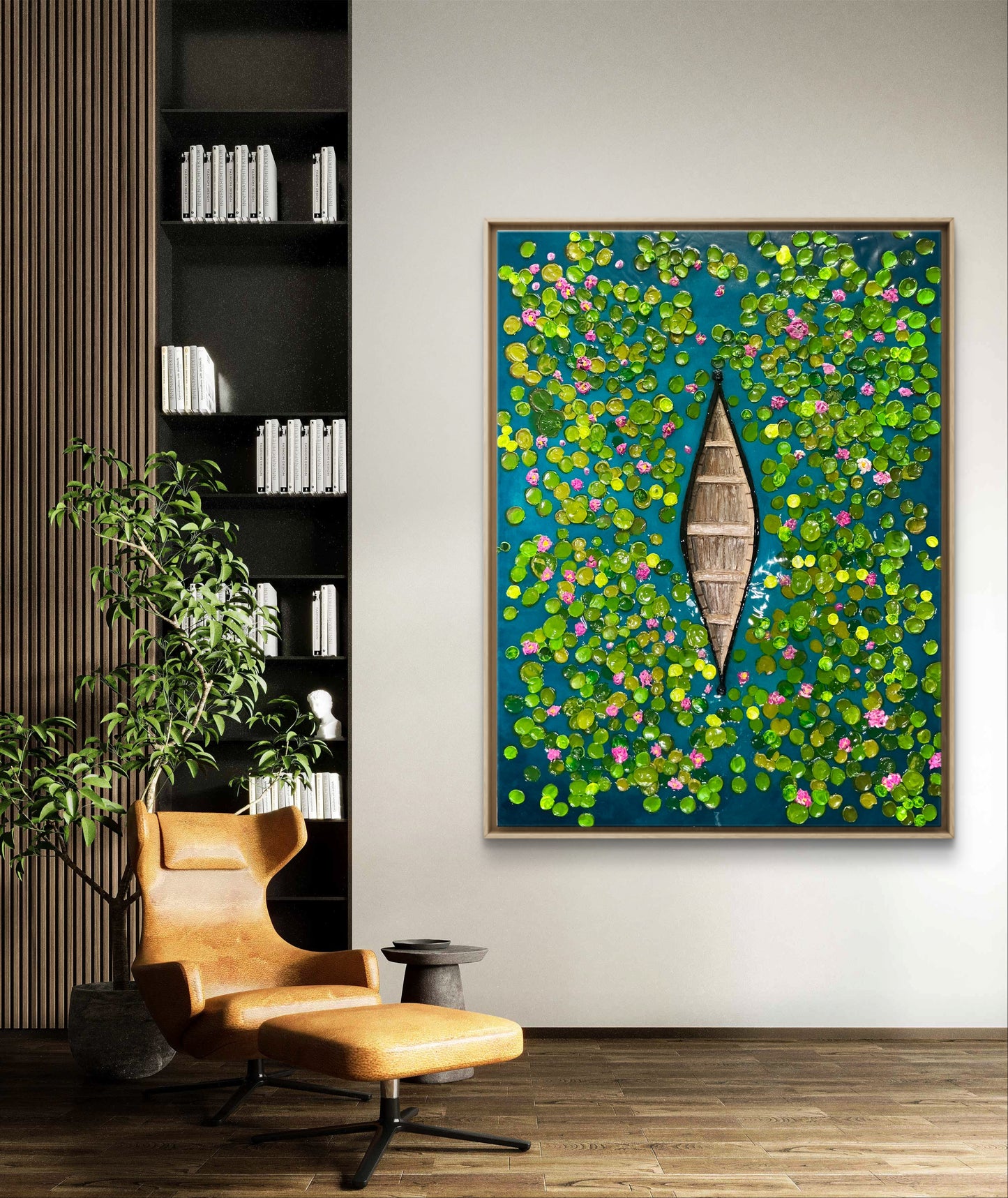 This is not just a painting; it is an experience, a sanctuary of calm and wonder. It evokes a longing for stillness, a desire to be lost in the embrace of nature’s elegance. The pond, alive yet peaceful, mirrors the rhythm of life itself—sometimes still, sometimes rippling with unseen currents, always carrying a quiet, enduring beauty.